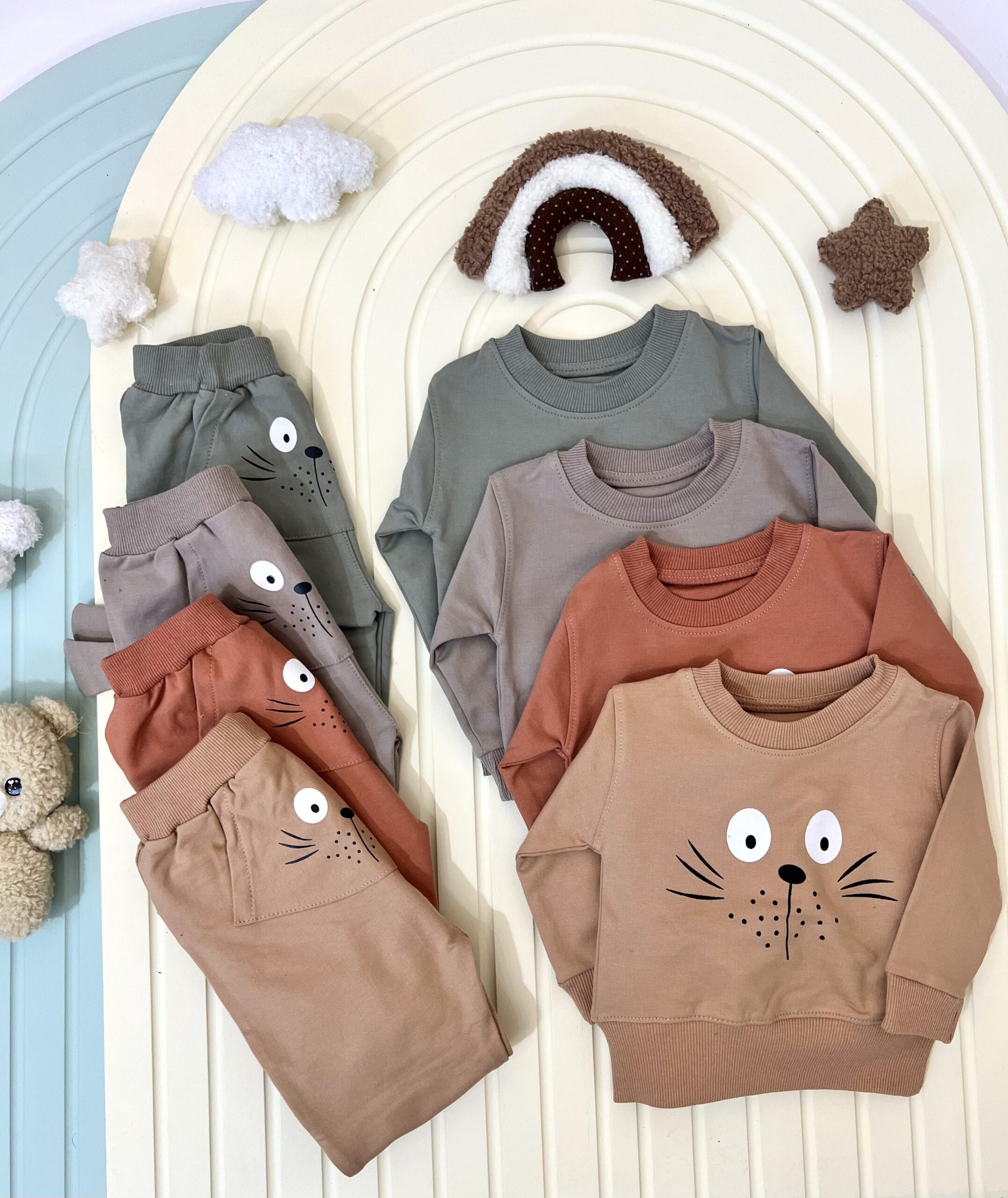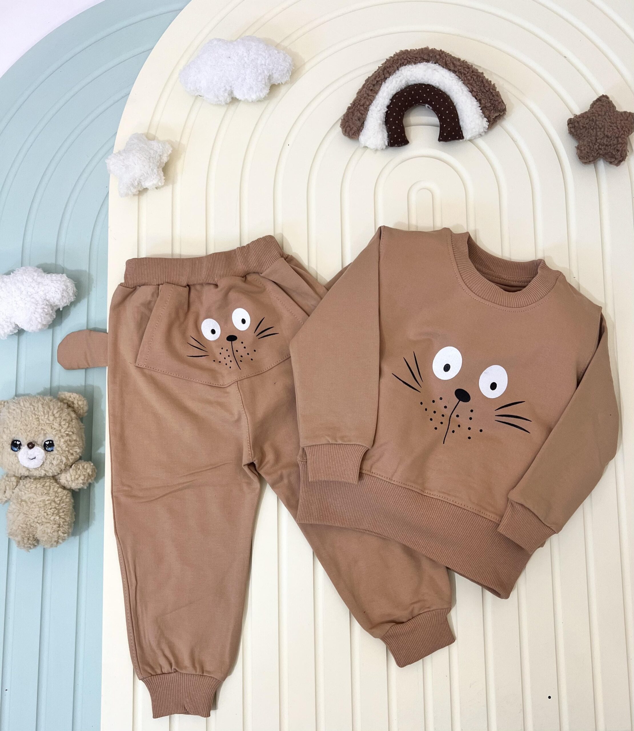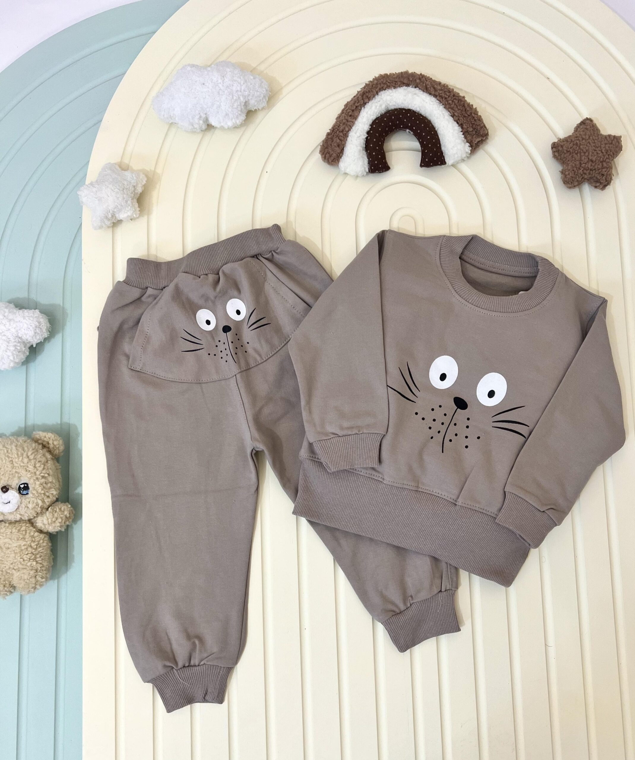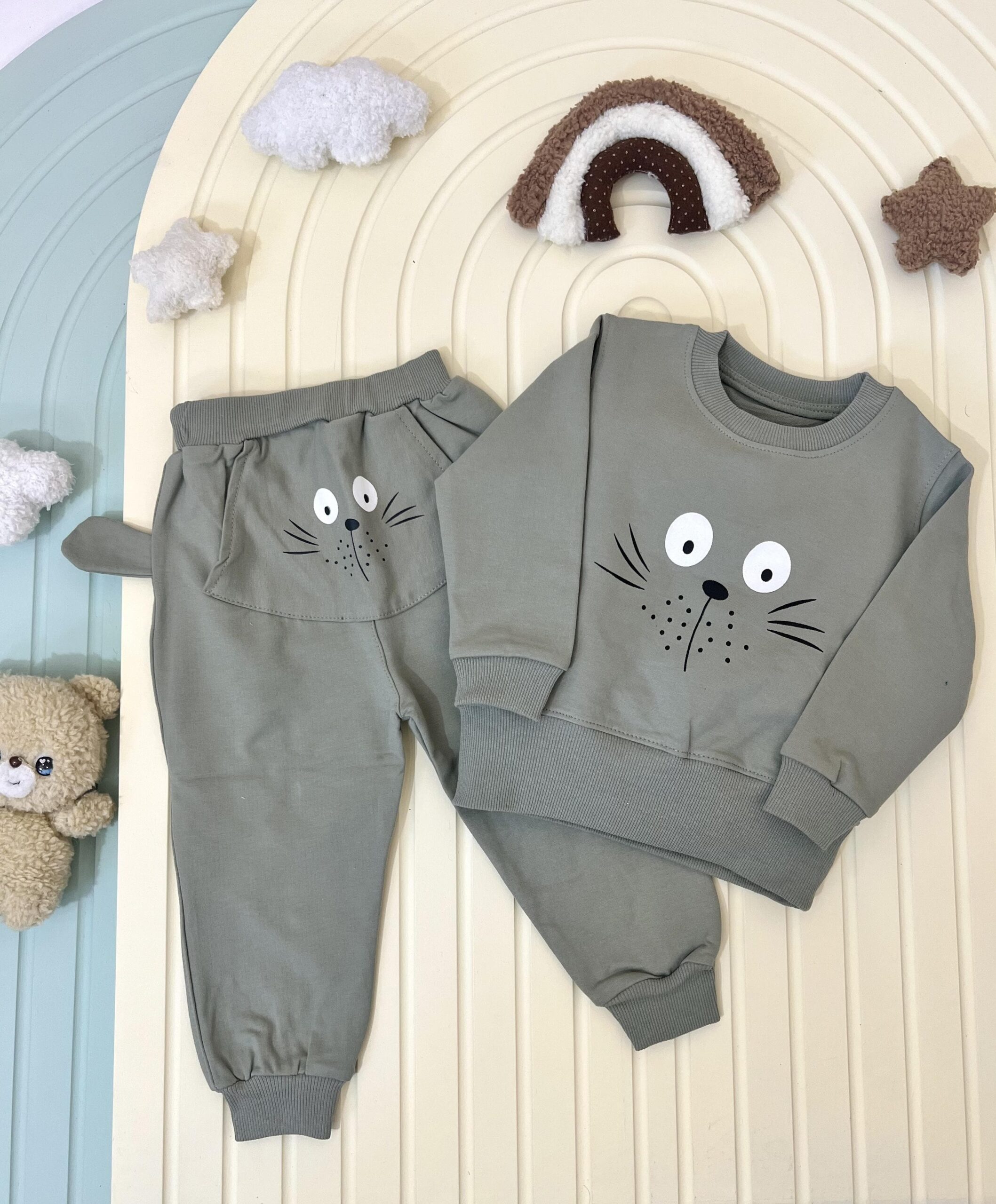ست راحتی طرح گربه با جنس نخ پنبه ی بسیار لطیف در رنگبندی زیبا با رنگ های سبز یشمی،اجری،کرم و موکا در فروشگاه دریم کید موجود است. ایت ست راحتی با وجود داشتن طرح گربه روی بلوز و پشت شلوار و داشتن دو گوش در سمت چپ و راست شلوار ظاهری بانمک و جذاب دارد. این ست در عین راحتی ظاهری شیک و مرتب به کودک شما در منزل میدهد. ست راحتی طرح گربه را با رنگبندی پاییزی و ظاهری زیبا و جذاب با تضمین بهترین قیمت و کیفیت میتوانید از فروشگاه دریم کید برای کوک دلبندتان تهیه کنید.